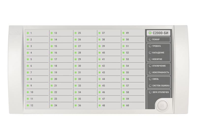 Предназначен для работы в составе ИСО "Орион" совместно с пультом контроля и управления "С2000" ("С2000М") и отображения с помощью встроенных индикаторов и звуковой сигнализации сообщений о событиях в 60 разделах системы.