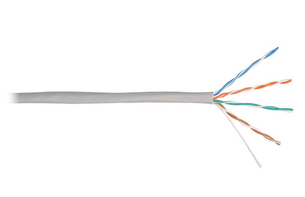 Неэкранированная витая пара; материал проводника: медь диаметром 0,53мм; материал оболочки: ПВХ (PVC); изоляция проводников: полиэтилен высокой плотности HDPE; внешняя оболочка диаметром 6,2мм. Белый цвет кабеля.