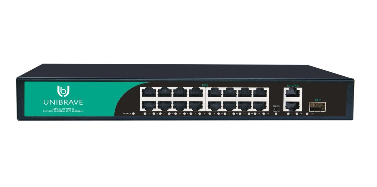 UB-SW-16F2G1SFP-200 Base Неуправляемый коммутатор Unibrave с поддержкой PoE на 16 портов, 2 Uplink 1000 Мбит/c и 1 SFP (200 Вт).